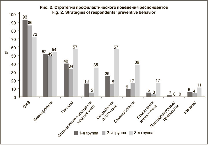 На рис. 1 показано, что стратегии поведения, связанные с ограничением социальных контактов в диапазоне от ограничения посещения людных мест до самоизоляции, респонденты называли реже по сравнению с использованием СИЗ, средств дезинфекции и соблюдением гигиены. Однако в ответах респондентов разных групп можно отметить существенные различия. Так, ограничение посещения людных мест чаще называли респонденты 3-й группы (р2–3 < 0,001, р1–3 = 0,025). Выбор этой стратегии профилактического поведения пациентами 2-й группы статистически значимо отличался от результатов, полученных в 1-й и 3-й группах (р = 0,048). Показательно, что среди предложенных стратегий поведения респонденты реже всего указывали на соблюдение социальной дистанции: 25, 15 и 57% соответственно (р1–3 = 0,001, р2–3 < 0,001).