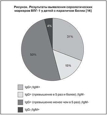 в развитии поражений нервной системы. Патология черепных нервов регистрируется у пациентов любого возраста, существенно нарушает трудоспособность и качество жизни. Наиболее распространена невропатия лицевого нерва (паралич Белла). При этом заболевании была выявлена высокая частота обнаружения маркеров ВПГ-1 и показана эффективность противовирусной терапии. Однако высокая распространенность герпетической инфекции в популяции, в том числе и среди здоровых лиц, не позволяет считать убедительными доказательства роли вируса в развитии паралича Белла. Представлен клинический пример развития паралича Белла у пациентки 27 лет на фоне обострения инфекции, вызванной ВПГ-1. Лечение противовоспалительными и нейротропными препаратами в сочетании со средствами для улучшения микроциркуляции, а также немедикаментозная терапия были неэффективны. После проведенного курса сохранялись субфебрильная температура тела, жалобы на асимметрию лица, головные боли, В анализе крови определялся лимфоцитоз и повышение титров антител IgM и IgG к ВПГ-1. Назначение ацикловира привело к купированию симптоматики.
