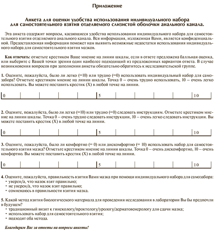 По результатам анкетирования, индивидуальный набор для самостоятельного взятия отделяемого слизистой оболочки анального канала легок и комфортен в использовании, инструкция по применению доступна для понимания. Оценка личных предпочтений пациентов при выборе способа взятия биологического материала показала, что только 4,7% опрошенных предпочли бы в будущем традиционный визит к врачу (гинекологу, проктологу, дерматовенерологу, урологу), что, вероятно, связано с большой закрытостью и стигматизацией данной группы.